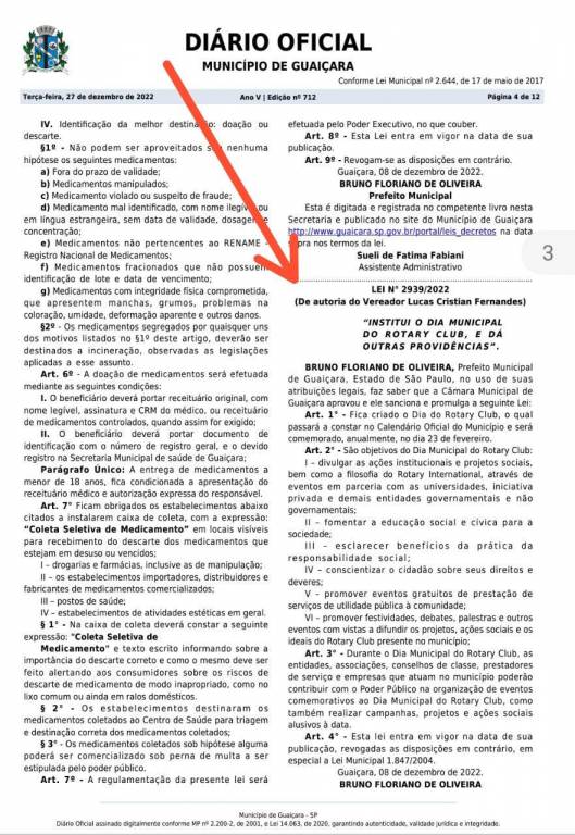 A Prefeitura Municipal de Guaiçara Institui o dia 23 de Fevereiro como Dia Municipal do Rotary Club