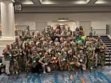 Um grande grupo de pessoas está reunido em um ambiente interno, participando de um evento formal, possivelmente a Assembleia Internacional do Rotary Internacional de 2025. A presença marcante do Brasil é evidente, com a maioria dos participantes vestindo roupas estampadas com motivos tropicais, predominantemente verdes, com detalhes em vermelho e amarelo, que podem ser trajes típicos ou uniformes representando o país. Algumas mulheres usam coroas de flores brancas, adicionando um toque festivo e cultural à ocasião.