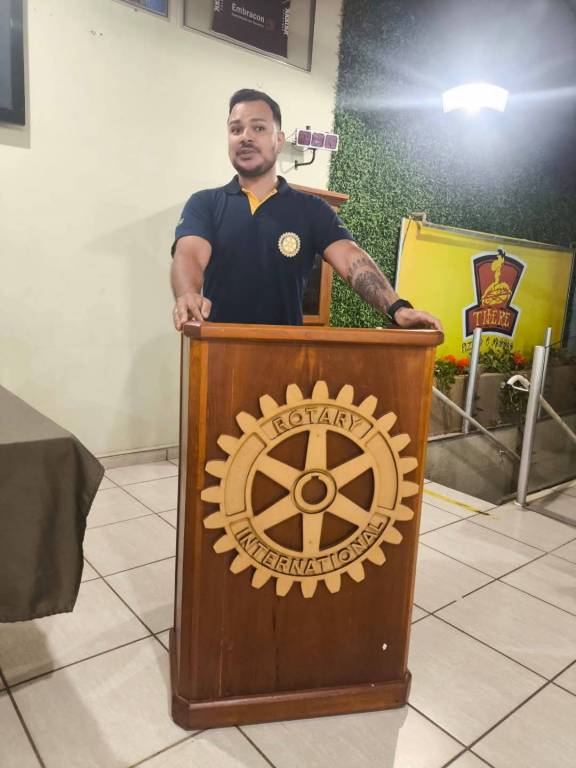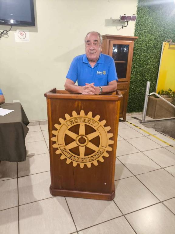 Dois homens estão em uma reunião do Rotary Club. O homem à esquerda está sentado à mesa, vestindo uma camisa azul com o logotipo do Rotary. Na mesa, há um sino dourado e um martelo de madeira. O homem à direita está em pé, falando em um púlpito de madeira com o emblema do Rotary. Ambos estão em um ambiente interno, com paredes decoradas e uma televisão desligada na parede. Há também um banner amarelo ao fundo com um logotipo vermelho.